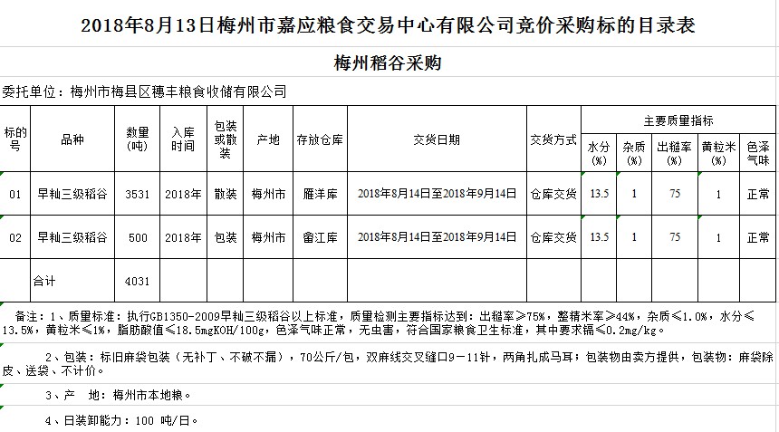受客戶委托,梅州市嘉應(yīng)糧食交易中心有限公司定于2018年8月13日(星期一)舉辦糧食競(jìng)價(jià)交易會(huì),梅州市梅縣區(qū)穗豐糧食收儲(chǔ)有限公司擬采購2018年早秈稻4031噸。