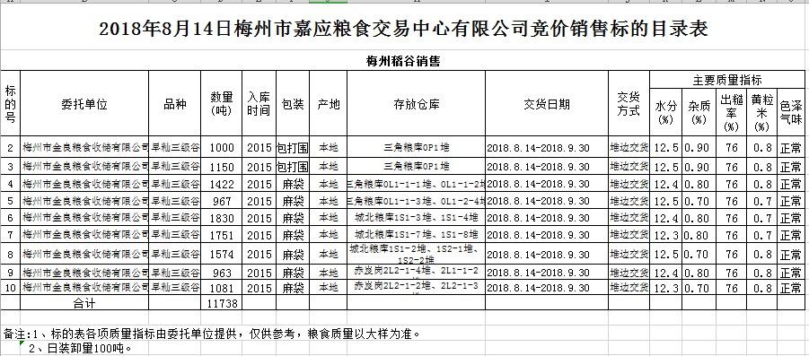 交易時(shí)間和地點(diǎn):2018年8月14日(星期二)上午10時(shí)。廣東省梅州市彬芳大道南161號(hào)梅州市糧食交易中心3樓。