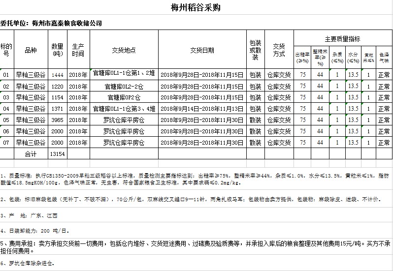 受客戶委托,梅州市嘉應(yīng)糧食交易中心有限公司定于2018年9月5日(星期三)舉辦糧食競(jìng)價(jià)交易會(huì),梅州市嘉泰糧食收儲(chǔ)公司擬采購2018年早秈稻13154噸。