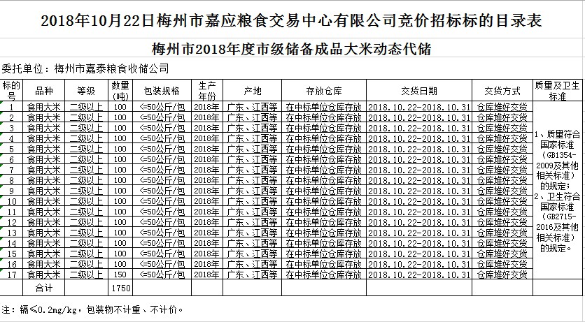 受客戶委托,梅州市嘉應(yīng)糧食交易中心有限公司定于2018年10月22日(星期一)上午10時在廣東省梅州市彬芳大道南161號梅州市糧食交易中心3樓,舉辦梅州市市級儲備成品糧油新一輪動態(tài)代儲公開招標(biāo)。