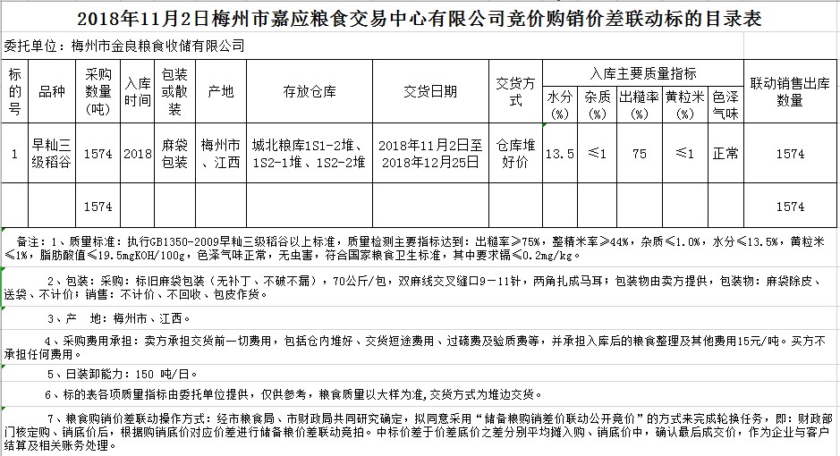 受客戶委托,梅州市嘉應(yīng)糧食交易中心有限公司定于2018年11月2日(星期五)舉辦稻谷購(gòu)銷價(jià)差聯(lián)動(dòng)標(biāo)的交易會(huì),梅州市金良糧食收儲(chǔ)有限公司擬銷售和采購(gòu)早秈稻1574噸。