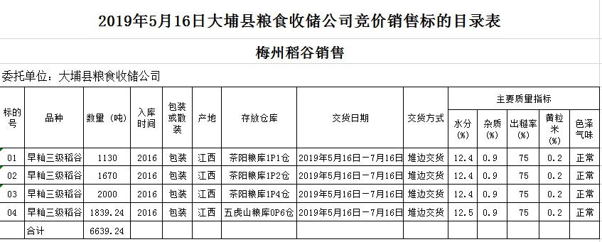 受客戶委托,梅州市嘉應(yīng)糧食交易中心有限公司定于2019年5月16日(星期四)舉辦糧食競價(jià)交易會,大埔縣糧食收儲公司擬銷售2016年早秈稻6639.24噸。
