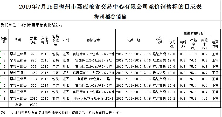 受客戶委托,梅州市嘉應(yīng)糧食交易中心有限公司定于2019年7月15日(星期一)舉辦糧食競價(jià)交易會(huì),梅州市嘉泰糧食收儲(chǔ)公司擬銷售2016年、2017年早秈稻9390噸。