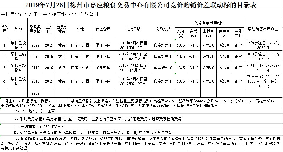 受客戶委托,梅州市嘉應糧食交易中心有限公司定于2019年7月26日(星期五)舉辦稻谷購銷價差聯(lián)動標的交易會,梅州市梅縣區(qū)穗豐糧食收儲有限公司擬銷售和采購早秈稻8727噸。
