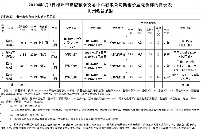 受客戶委托,梅州市嘉應糧食交易中心有限公司定于2019年8月7日(星期三)舉辦稻谷購銷價差聯(lián)動標的交易會,梅州市金良糧食收儲有限公司擬銷售和采購早秈稻9998噸。