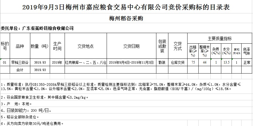 交易時(shí)間和地點(diǎn):2019年9月3日(星期二)上午10時(shí)。廣東省梅州市彬芳大道南161號(hào)梅州市糧食交易中心3樓。