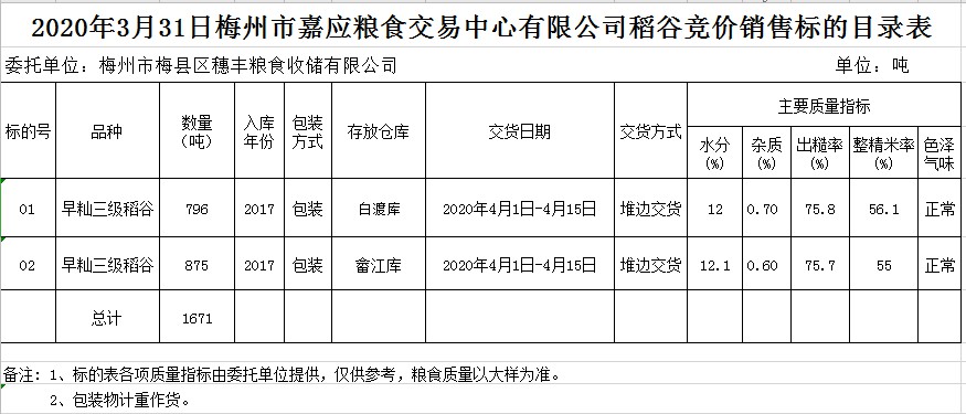 受客戶委托,梅州市嘉應糧食交易中心有限公司定于2020年3月31日(星期二)舉辦糧食競價交易會,梅州市梅縣區(qū)穗豐糧食收儲有限公司擬銷售2017年早秈稻1671噸。
