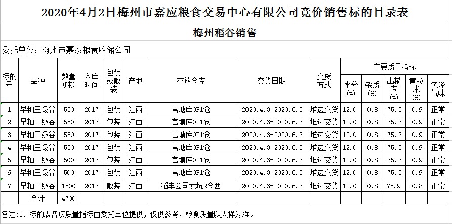 受客戶委托,梅州市嘉應(yīng)糧食交易中心有限公司定于2020年4月2日(星期四)舉辦糧食競(jìng)價(jià)交易會(huì),梅州市嘉泰糧食收儲(chǔ)公司擬銷售2017年早秈稻4700噸。