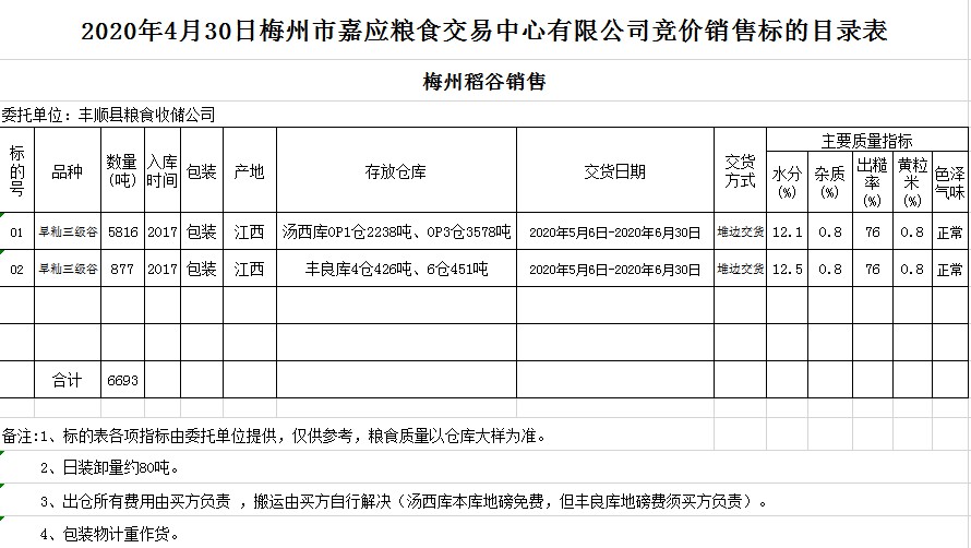 交易時間和地點:2020年4月30日(星期四)上午10時。廣東省梅州市彬芳大道南161號梅州市糧食交易中心3樓。