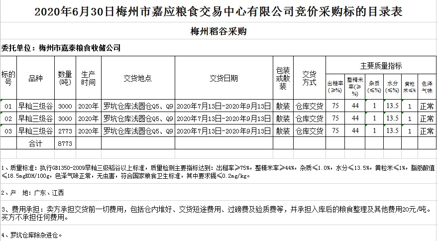 交易時間和地點:2020年6月30日(星期二)上午10時15分。廣東省梅州市彬芳大道南161號梅州市糧食交易中心3樓。