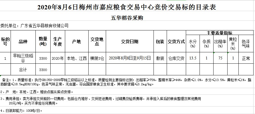 受客戶委托,梅州市嘉應(yīng)糧食交易中心有限公司定于2020年8月6日(星期四)舉辦糧食競(jìng)價(jià)交易會(huì),廣東省五華縣糧食收儲(chǔ)公司擬采購(gòu)2020年早秈稻3300噸。