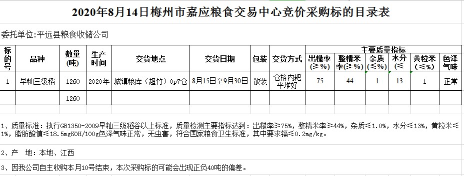 受客戶委托,梅州市嘉應(yīng)糧食交易中心有限公司定于2020年8月14日(星期五)舉辦糧食競價交易會,平遠縣糧食收儲公司擬采購2020年早秈稻1260噸。