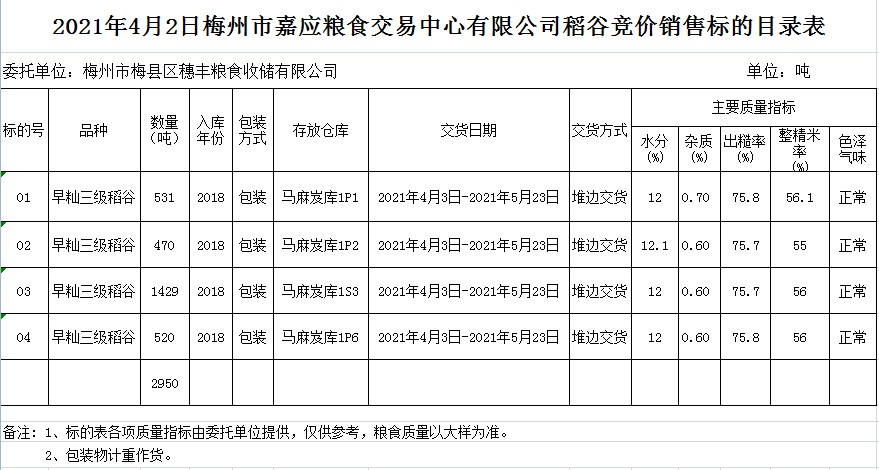 受客戶委托,梅州市嘉應糧食交易中心有限公司定于2021年4月2日(星期五)舉辦糧食競價交易會。梅州市梅縣區(qū)穗豐糧食收儲有限公司擬銷售2018年早秈稻2950噸。
