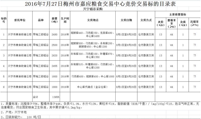 受客戶委托,梅州市嘉應(yīng)糧食交易中心有限公司定于2016年7月27日舉辦糧食競價交易會,興寧市糧食收儲公司擬采購2016年產(chǎn) 興寧本地早秈三級稻谷13655噸。