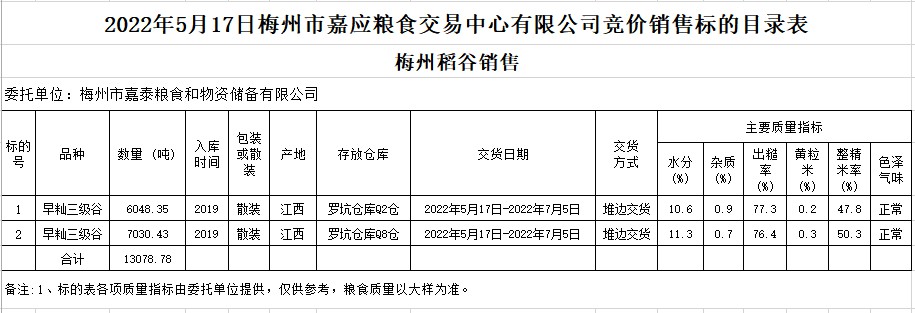 受客戶(hù)委托,梅州市嘉應(yīng)糧食交易中心有限公司定于2022年5月17日(星期二)舉辦糧食競(jìng)價(jià)交易會(huì)。梅州市嘉泰糧食和物資儲(chǔ)備有限公司擬銷(xiāo)售2019年早秈稻13078.78噸。