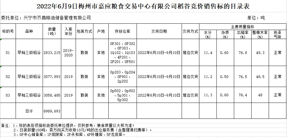 受客戶委托,梅州市嘉應(yīng)糧食交易中心有限公司定于2022年6月9日(星期四)舉辦糧食競(jìng)價(jià)交易會(huì)。興寧市齊昌糧油儲(chǔ)備管理有限公司擬銷售2019、2020年早秈稻8969.693噸。