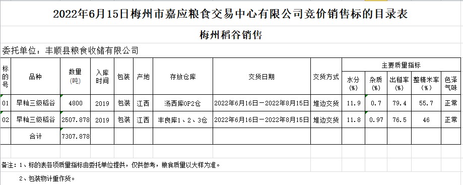 受客戶委托,梅州市嘉應(yīng)糧食交易中心有限公司定于2022年6月15日(星期三)舉辦糧食競價交易會。豐順縣糧食收儲有限公司擬銷售2019年早秈稻7307.878噸。