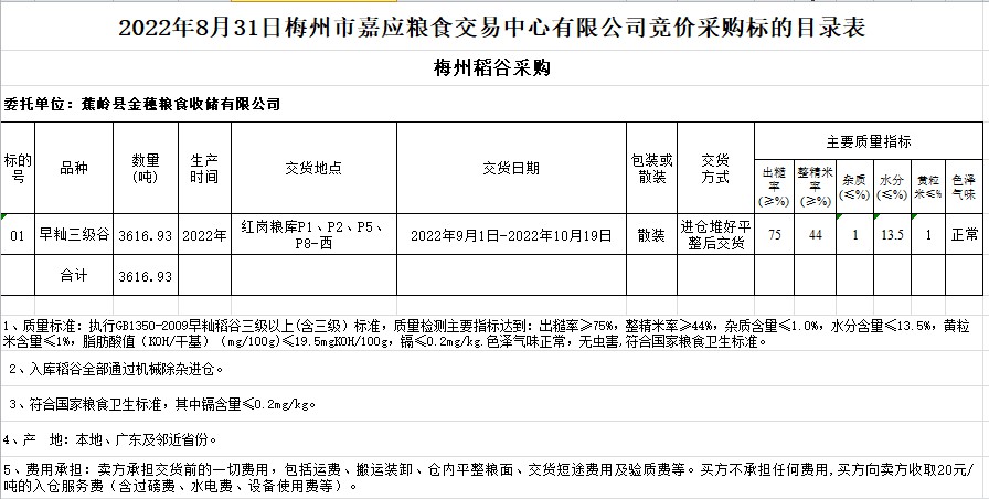 受客戶委托,梅州市嘉應(yīng)糧食交易中心有限公司定于2022年8月31日(星期三)舉辦糧食競(jìng)價(jià)交易會(huì)。蕉嶺縣金穗糧食收儲(chǔ)有限公司擬采購(gòu)2022年早秈稻3616.93噸。