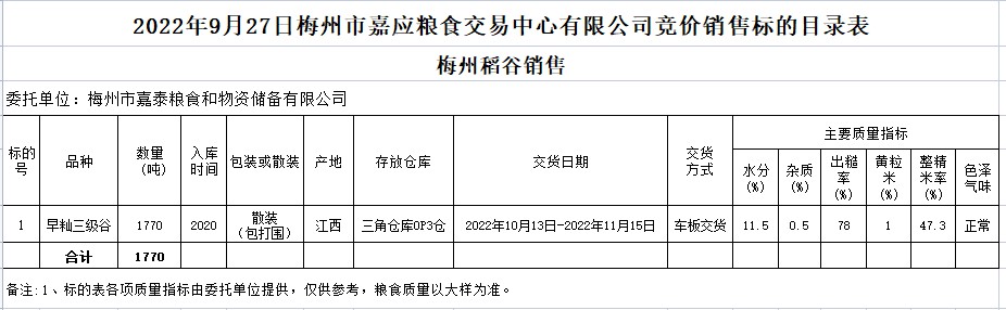 受客戶委托,梅州市嘉應糧食交易中心有限公司定于2022年9月27日(星期二)舉辦糧食競價交易會。梅州市嘉泰糧食和物資儲備有限公司擬銷售2020年早秈稻1770噸。