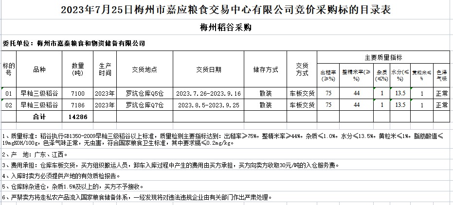 受客戶委托,梅州市嘉應(yīng)糧食交易中心有限公司定于2023年7月25日(星期二)舉辦糧食競價交易會。梅州市嘉泰糧食和物資儲備有限公司擬采購2023年早秈稻14286噸。