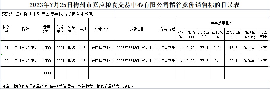 受客戶(hù)委托,梅州市嘉應(yīng)糧食交易中心有限公司定于2023年7月25日(星期二)舉辦糧食競(jìng)價(jià)交易會(huì)。梅州市梅縣區(qū)穗豐糧食收儲(chǔ)有限公司擬銷(xiāo)售2021年早秈稻3000噸。