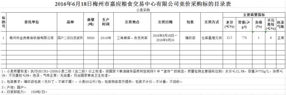 受客戶委托,梅州市嘉應(yīng)糧食交易中心有限公司定于2016年8月18日舉辦糧食競價交易會,梅州市金良糧食收儲有限公司擬采購2016年產(chǎn)二級硬質(zhì)小麥5500噸。