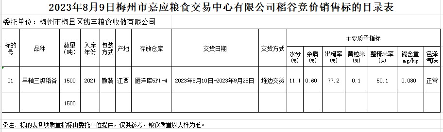 受客戶委托,梅州市嘉應糧食交易中心有限公司定于2023年8月9日(星期三)舉辦糧食競價交易會。梅州市梅縣區(qū)穗豐糧食收儲有限公司擬銷售2021年早秈稻1500噸。