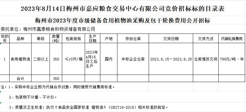受梅州市嘉泰糧食和物資儲備有限公司委托,梅州市嘉應(yīng)糧食交易中心有限公司定于2023年8月14日(星期一)上午10時15分舉辦梅州市市級儲備食用植物油采購及包干輪換費用公開招標。