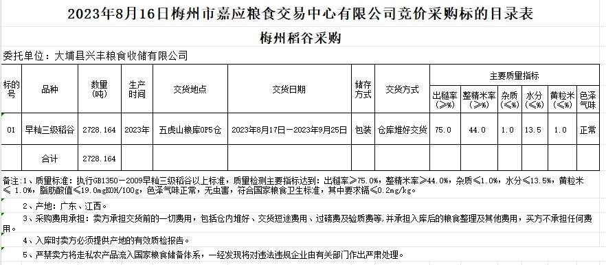 2023年8月16日大埔縣興豐糧食收儲(chǔ)有限公司稻谷采購(gòu)