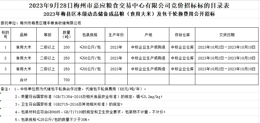 文件下載:2023年9月28日梅縣區(qū)2023年本級動態(tài)儲備成品糧采購及包干輪換費用公開招投標公告