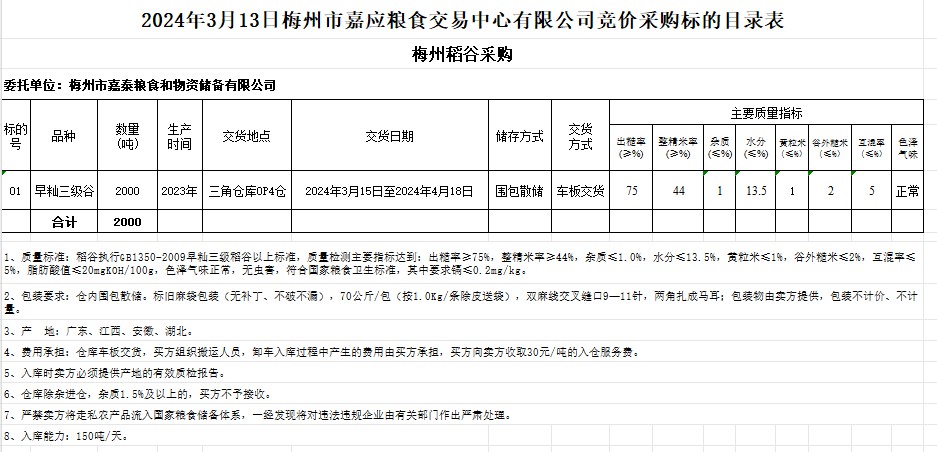 受客戶委托,梅州市嘉應(yīng)糧食交易中心有限公司定于2024年3月13日(星期三)舉辦糧食競價(jià)交易會。梅州市嘉泰糧食和物資儲備有限公司擬采購2023年早秈稻2000噸。