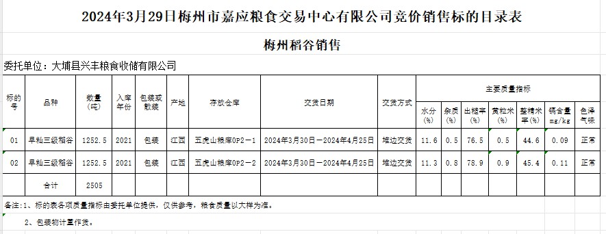 受客戶委托,梅州市嘉應(yīng)糧食交易中心有限公司定于2024年3月29日(星期五)舉辦糧食競價(jià)交易會(huì)。大埔縣興豐糧食收儲(chǔ)有限公司擬銷售2021年早秈稻2505噸。