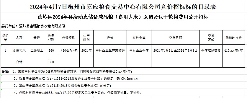 蕉嶺縣2024年縣級(jí)動(dòng)態(tài)儲(chǔ)備成品糧(食用大米)采購(gòu)及包干輪換費(fèi)用公開招標(biāo)公告