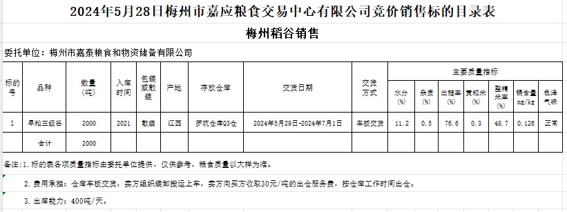 受客戶委托,梅州市嘉應(yīng)糧食交易中心有限公司定于2024年5月28日(星期二)舉辦糧食競(jìng)價(jià)交易會(huì)。梅州市嘉泰糧食和物資儲(chǔ)備有限公司擬銷售2021年產(chǎn)早秈稻2000噸。