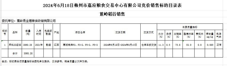 受客戶委托,梅州市嘉應(yīng)糧食交易中心有限公司定于2024年6月18日(星期二)舉辦糧食競價(jià)交易會(huì)。蕉嶺縣金穗糧食收儲(chǔ)有限公司擬銷售2021年產(chǎn)早秈稻3060.28噸。