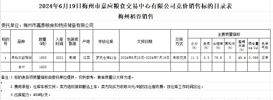 受客戶委托,梅州市嘉應(yīng)糧食交易中心有限公司定于2024年6月19日(星期三)舉辦糧食競價交易會。梅州市嘉泰糧食和物資儲備有限公司擬銷售2021年產(chǎn)早秈稻1600噸。