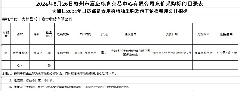 受大埔縣興豐糧食收儲(chǔ)有限公司委托,梅州市嘉應(yīng)糧食交易中心有限公司定于2024年6月26日(星期三)上午10時(shí)在廣東省梅州市彬芳大道南161號(hào)梅州市糧食交易中心3樓,舉辦大埔縣2024年縣級(jí)儲(chǔ)備食用植物油采購及包干輪換費(fèi)用公開招標(biāo)。