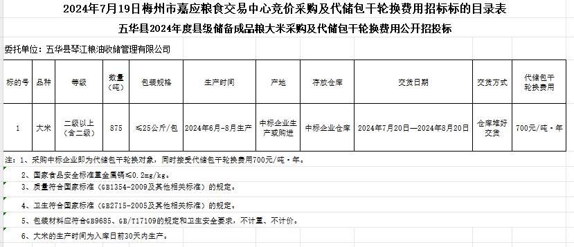 五華縣2024年度縣級(jí)儲(chǔ)備成品糧大米采購及代儲(chǔ)包干輪換費(fèi)用公開招標(biāo)公告