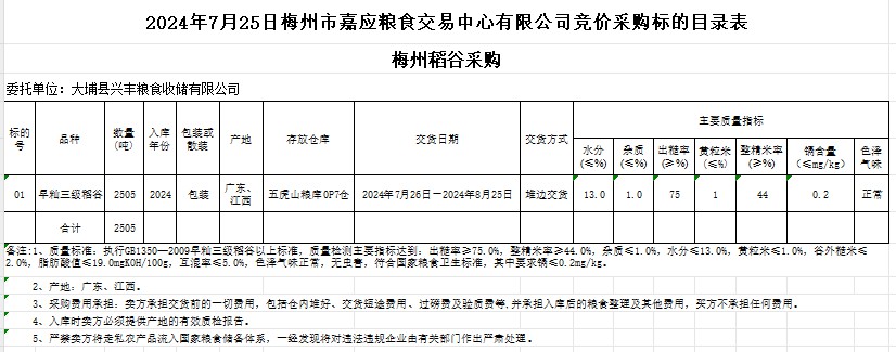 受客戶委托,梅州市嘉應(yīng)糧食交易中心有限公司定于2024年7月25日(星期四)舉辦糧食競價(jià)交易會。大埔縣興豐糧食收儲有限公司擬采購2024年產(chǎn)早秈稻谷2505噸。