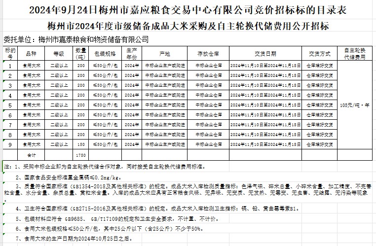 梅州市2024年度市級(jí)儲(chǔ)備成品大米采購(gòu)及自主輪換代儲(chǔ)費(fèi)用公開招標(biāo)公告