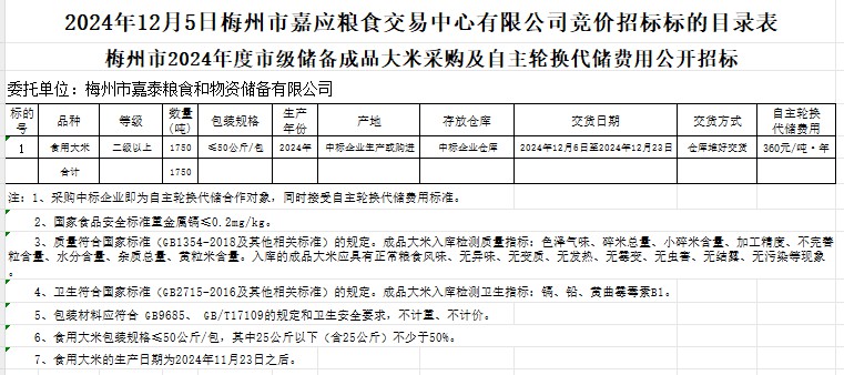 梅州市2024年度市級(jí)儲(chǔ)備成品大米采購及自主輪換代儲(chǔ)費(fèi)用公開招標(biāo)公告