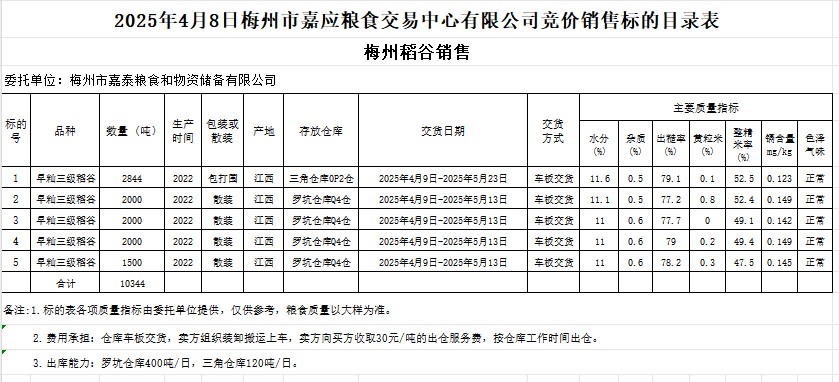 受客戶委托,梅州市嘉應(yīng)糧食交易中心有限公司定于2025年4月8日(星期二)舉辦糧食競價交易會。梅州市嘉泰糧食和物資儲備有限公司擬銷售2022年產(chǎn)早秈稻谷10344噸。