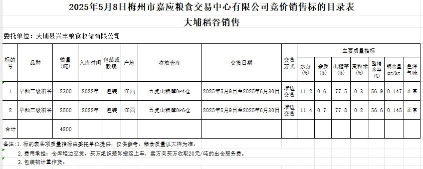 受客戶委托,梅州市嘉應(yīng)糧食交易中心有限公司定于2025年5月8日(星期四)舉辦糧食競(jìng)價(jià)交易會(huì)。大埔縣興豐糧食收儲(chǔ)有限公司擬銷售2022年產(chǎn)早秈稻谷4800噸。