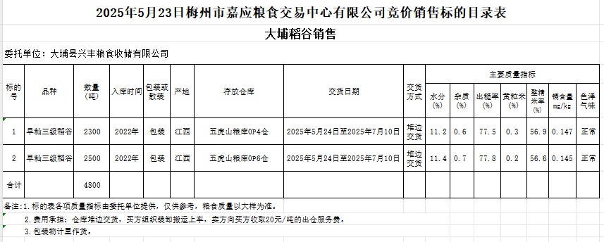 受客戶委托,梅州市嘉應(yīng)糧食交易中心有限公司定于2025年5月23日(星期五)舉辦糧食競(jìng)價(jià)交易會(huì)。大埔縣興豐糧食收儲(chǔ)有限公司擬銷售2022年產(chǎn)早秈稻谷4800噸。