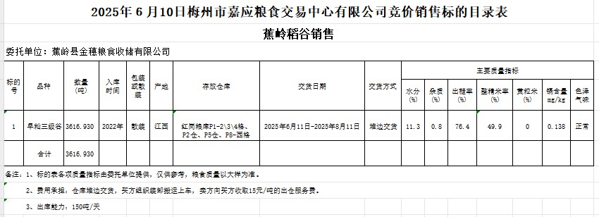受客戶委托,梅州市嘉應(yīng)糧食交易中心有限公司定于2025年6月10日(星期二)舉辦糧食競價交易會。蕉嶺縣金穗糧食收儲有限公司擬銷售2022年產(chǎn)早秈稻谷3616.930噸。