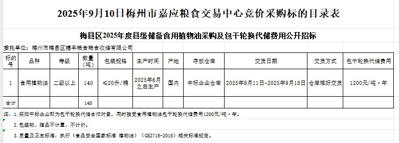 梅縣區(qū)2025年度縣級儲備食用植物油采購及包干輪換代儲費用公開招標公告