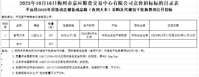 平遠(yuǎn)縣2025年縣級(jí)動(dòng)態(tài)儲(chǔ)備成品糧(食用大米)采購(gòu)及代儲(chǔ)包干輪換費(fèi)用公開(kāi)招標(biāo)公告