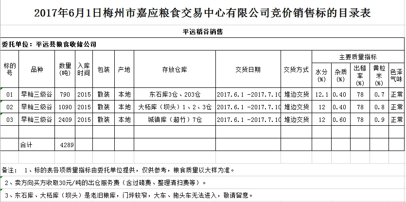 受客戶委托,梅州市嘉應(yīng)糧食交易中心有限公司定于2017年6月1日舉辦糧食競價交易會,平遠縣糧食收儲公司擬銷售2015年早秈三級稻谷4289噸。