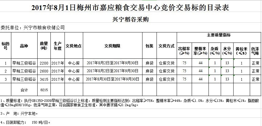 受客戶委托,梅州市嘉應(yīng)糧食交易中心有限公司定于2017年8月1日舉辦糧食競(jìng)價(jià)交易會(huì),興寧市糧食收儲(chǔ)公司擬采購(gòu)2017年早秈三級(jí)稻谷共8215噸。