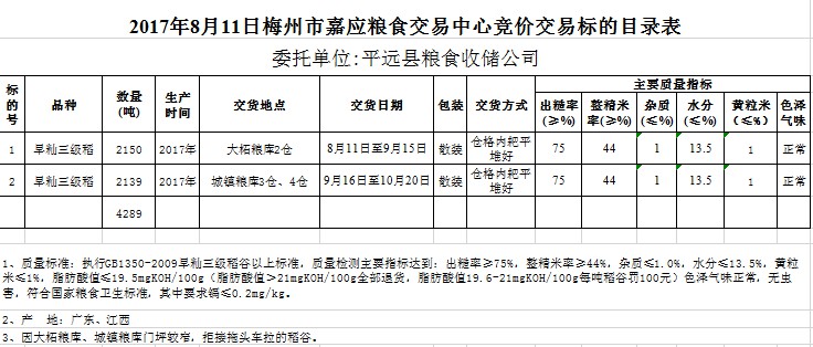 受客戶委托,梅州市嘉應(yīng)糧食交易中心有限公司定于2017年8月11日舉辦糧食競價交易會,平遠(yuǎn)縣糧食收儲公司擬采購2017年早秈三級稻谷共4289噸。